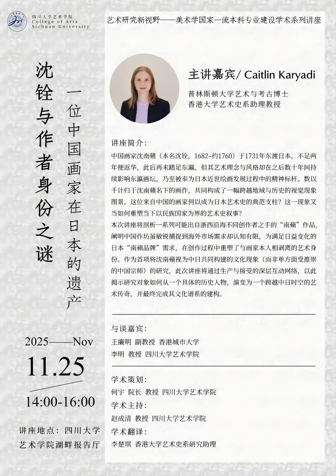 2025年11月25日下午,由四川大学艺术学院主办,四川大学艺术学院院长何宇教授策划的“艺术研究新视野——美术学国家一流本科专业建设学术系列讲座”《沈铨与作者身份之谜:一位中国画家在日本的遗产》在艺术学院湖畔报告厅顺利举办。本次讲座特邀普林斯顿大学艺术与考古博士、香港大学艺术史系Caitlin Karyadi助理教授担任主讲。讲座由四川大学艺术学院艺术史系赵成清教授担任学术主持。香港城市大学王廉明副教授、四川大学艺术学院李明教授担任与谈嘉宾。四川大学艺术学院环境设计系赵志红教授、四川大学艺术学院绘画系张军副教授出席了本次讲座。学院本、硕、博学生参加了此次讲座。