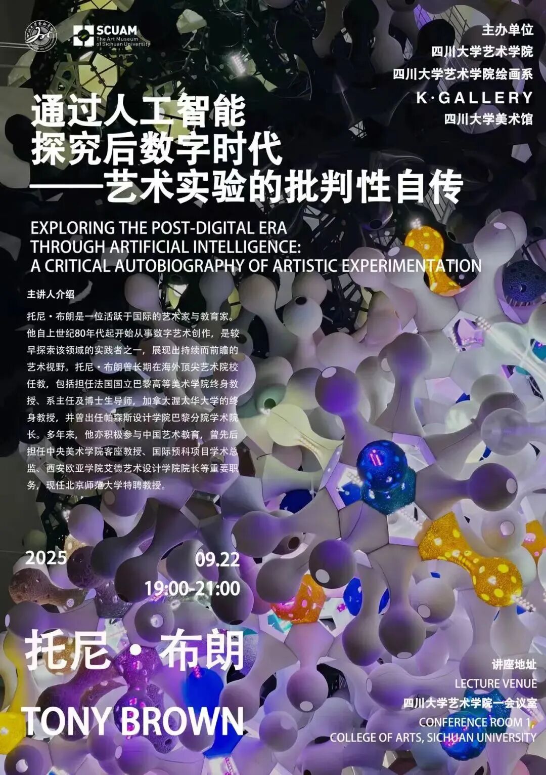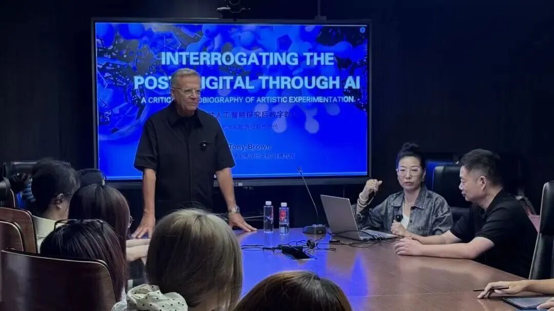 2025年9月22日19时,由四川大学艺术学院、四川大学艺术学院绘画系及K空间、四川大学美术馆联合主办的一场题为“通过人工智能探究后数字时代——艺术实验的批判性自传”的学术讲座,于四川大学艺术学院一会议室成功举办。在四川大学艺术学院绘画系系主任、四川大学美术馆馆长熊宇的开场致辞后,主讲人、国际著名艺术家与教育家托尼·布朗(Tony Brown)教授正式开启了这场思想之旅。