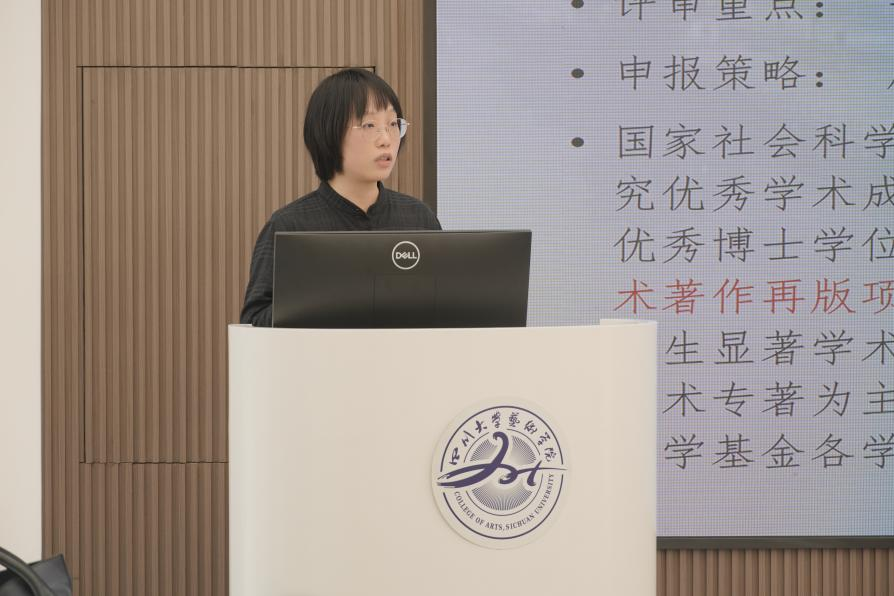 青年教师江秋萌分享了国家社会科学基金后期资助项目申报心得。她围绕该项目的申报政策、核心要求与关键环节进行了详细解读,并就项目申报的注意事项、申请书撰写规范等实务要点,与在场教师作了交流分享。