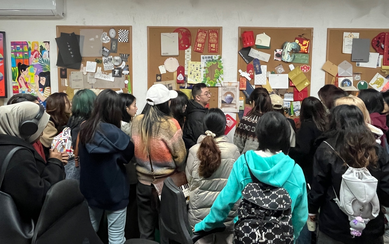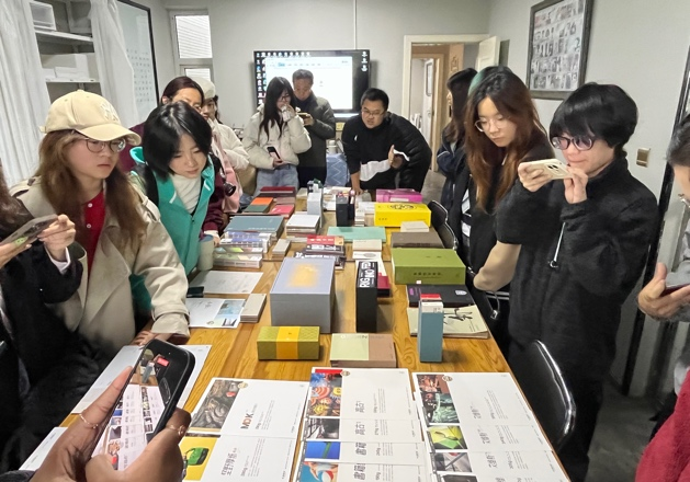 午后,同学们来到位于梵木Flying国际文创公园的印立德公司。在这里,设计的蓝图通过一道道精湛的工艺,实现于纸张之上:丝网印刷以其极高的遮蔽率和墨层质感,适合表现强烈、厚重的色彩;烫金工艺中,哑光金因其清晰度高、轮廓扎实的特点,呈现出不同于亮光金的沉稳高级感;在图形处理上,模切的线条边缘更显圆润自然,而激光雕刻则能实现极为精细复杂的图案;令人印象深刻的立体烫工艺,需要特殊的双板模具才能实现浮雕般的突起效果,其工艺难度与成本也相应更高……最后,一场关于书籍“装帧”的科普展开:从经济高效的胶装,到牢固耐翻的锁线装,再到常用于册子的骑马钉,不同的装订方式决定了书籍的形态、寿命与阅读体验。