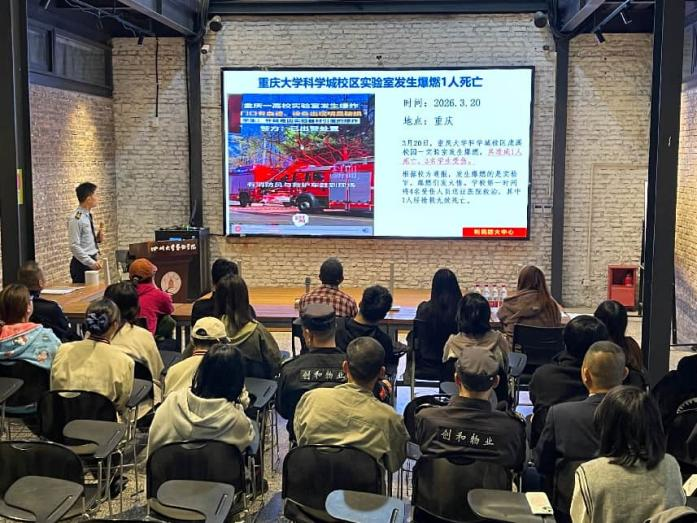 在培训宣讲中,刘凯教官详细分析了实验室常见爆燃事故的类型与诱因,梳理了师生进入实验室后易出现的各类不安全行为,引导参训人员对照自查、及时整改。针对实验室安全隐患排查与杜绝,他从五个关键环节进行了系统讲解:用电与设备过载防控,强调要严格控制用电负荷,定期检查电气设施,杜绝线路老化、违规用电等问题;易燃品与危化品管理,明确储存、使用、处置的规范要求,防范泄漏、引燃等风险;机械与高温防护,提醒参训人员严格遵守操作规程,正确使用防护设备;化学吸入与粉尘防护,强调通风防护的重要性,规范个人防护用品的使用;疏散通道与杂物清理,要求保持通道畅通,及时清理易燃杂物,保障应急疏散安全。同时,刘凯教官现场演示了各类灭火器械的使用方法,明确不同灭火器械的适用场景,让参训人员直观掌握实操技能。