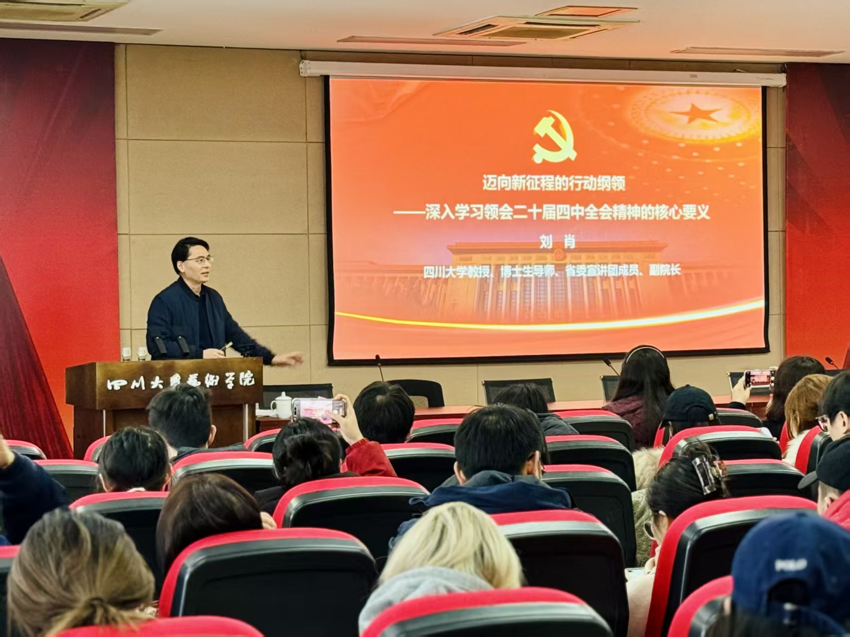 为深入学习贯彻党的二十届四中全会精神,12月18日下午,艺术学院在A1-11会议室举行了以“迈向新征程的行动纲领——深入学习领会二十届四中全会精神的核心要义”为主题的专题宣讲报告会。本次宣讲报告会由马克思主义学院副院长刘肖教授主讲,艺术学院党委书记覃孟念主持,全院师生党员、发展对象及入党积极分子代表参加。