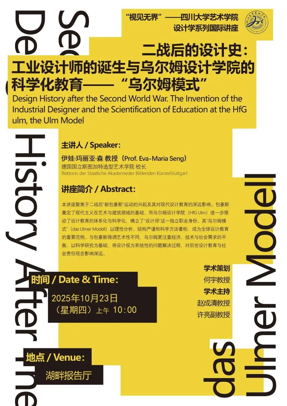 2025年10月23日上午,由四川大学艺术学院主办,四川大学艺术学院院长何宇教授策划的“视见无界”设计学系列国际讲座《二战后的设计史:工业设计师的诞生与乌尔姆设计学院的科学化教育——“乌尔姆模式”》在艺术学院湖畔报告厅顺利举行。本次讲座特邀德国国立斯图加特造型艺术学院(Staatliche Akademieder Bildenden Künste Stuttgart)校长、著名艺术史与设计史学者伊娃·玛丽·森教授、博士(Prof. Dr. Prof. h.c. mult. Eva-Maria Seng)担任主讲。讲座由四川大学艺术学院艺术史系赵成清教授和设计与媒体艺术系系主任许亮副教授主持,王莉莉副教授、李贞老师以及四川大学艺术学院设计系及美术学系本、硕、博学生参加了此次讲座。