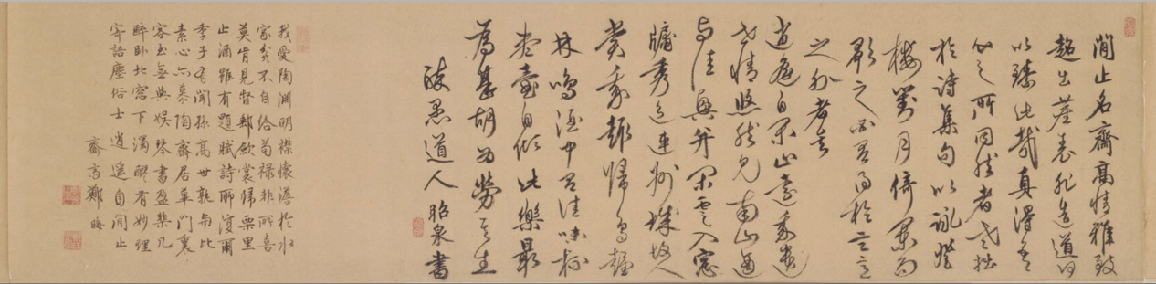 徽州理学积淀深厚,詹炟《赵东山行状》道:“新安自朱子后,儒学之盛称天下,号东南邹鲁。”同时徽州也是朱元璋较早控制的地区之一,因而此地士人与吴人遭受的敌视迥然有别,在朱元璋扶持下理学持续繁盛,也反映在跋文当中。此卷题跋诗文的重点并不在描述斋室营建的面貌和所处环境的自然风光,而是集中于主人之慕陶。吴致中在画上集陶诗以跋,唐桂芳记文以渊明事迹释“闲止”二字,其他题跋也是如此,均颂主人可以逍遥恬退,并在元明改朝换代之际提及陶渊明“耻事异姓”“避世侪商老,名轩慕晋人”,赞许吴彦能避世守节。