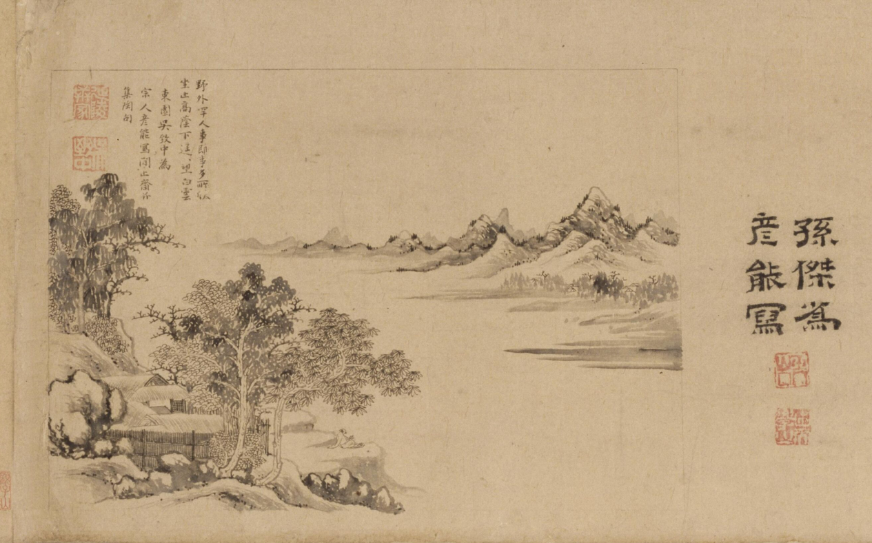 最后回到在长篇题跋中不甚显眼的画作上来,画作采一水两岸、对角构图,前景布置三五棵高树,数块巨石,轮廓有卷云皴画法,远山则用披麻长皴。屋舍绕以栅栏,内部建筑结构不明,主人闲坐岸边。对于画家吴致中,仅可知其出身溪南吴氏,画作树干线条嫩弱、造型呆板,坡石轮廓存在反覆勾摹的痕迹,同时又能工稳小楷,或可推测他是业余的文人画家。此图沿用元代斋室图常见图式,与时期相近的诸多斋室作品如《竹西草堂图》《秀野轩图》如出一辙,因此未必与闲止斋实景相合。