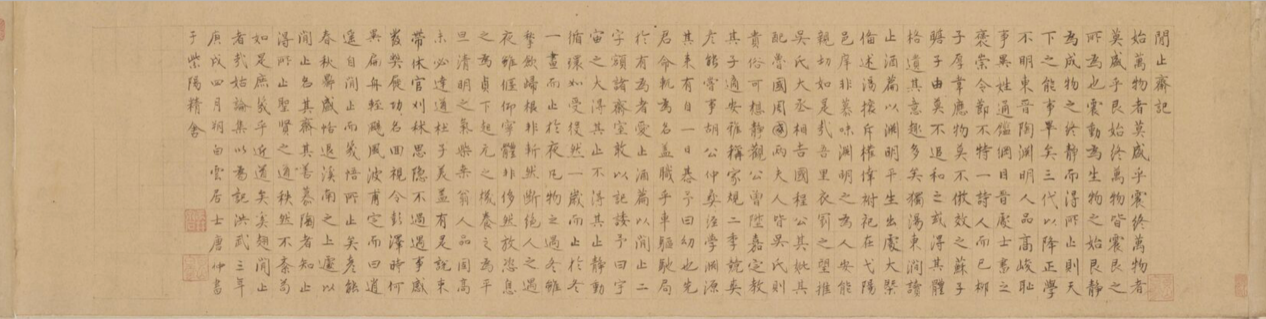 此外,不同于多人合作而成的元人长卷常由数段不同纸张裱成一卷,此卷完整而纸质、纸色统一,并且包括引首画心、记文在内的七段纸长度大致相当,应为吴彦能预备提供。其中唐桂芳记文单独用一纸,上有界格;范准长跋同有界格,据文中“且以其友吴彦能闲止斋之诗卷见示,俾属辞于末”“书于卷末”等语,这段文字的性质实为后序或后记,应为诗画卷主体部分完成后,再请范准为文作结。这种形式常见于元代斋室卷中,如元人《友竹轩诗文》卷(上海博物馆藏)的组成即包含记、诗文、后序。由此可见吴彦能的悉心筹划了从篆书匾额、画作到记、诗、序各部分,也说明斋室卷的程式在元末已为人熟知。