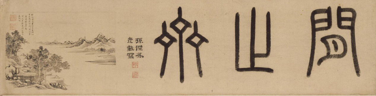 从形制与装帧上看,此卷显示出精心的布置安排:首先,最为特别之处在于引首的篆书斋名和《闲止斋图》在同一张纸上,画作特以墨线框出范围(图2),大小幅面恰好合适,说明篆书匾额与画作的位置都由主人事先计划,预留好纸张,再请画家与书家落笔。