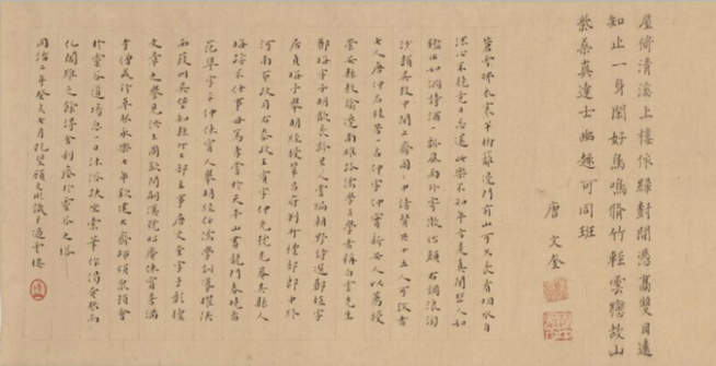 手卷以往多被认为是密友分享交流的书画载体,但元代手卷中转介求文风气兴盛。黄庭坚(1045-1105)曾被客人要求为一座未闻、未见的佛堂题诗,他在诗中牢骚到:“客从潭府渡河梁,籍甚传夸静照堂。”对静照堂一无所知,难以下笔。至元代风气一变,如杨维桢的斋室记文为例,其中有不少篇目的受赠者都并不相识,如《槐荫亭记》“又介吾门管生讷求余言为志”,《野亭记》“又介吾友陈栢谒余七者寮求记”,《光霁堂记》“因友生马琬求记于余”等。同时,卷中先题咏者的名声,可能招来更多文人继续题咏,从而建立起新的人际关系,本卷中名儒唐桂芳的题跋便为吴彦能的斋室卷增重不少,类似例子文献中如元人苟宗道诗序:“……故榜其所居之室曰‘怡斋’。诸名公皆有诗,西溪秋涧其首倡也”,即因王恽首题而吸引到更多的诗作。因此,尽管隐居奉养、文名不显,吴彦能借助亲友突破有限的交游范围从而获得更多题跋。